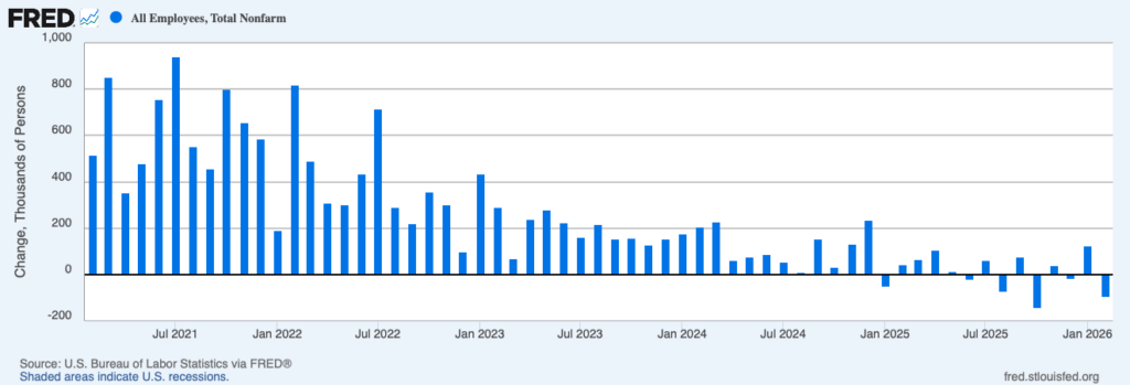 Figure 1. Monthly Change in Nonfarm Payroll Employment, Feb 2021 – Feb 2026